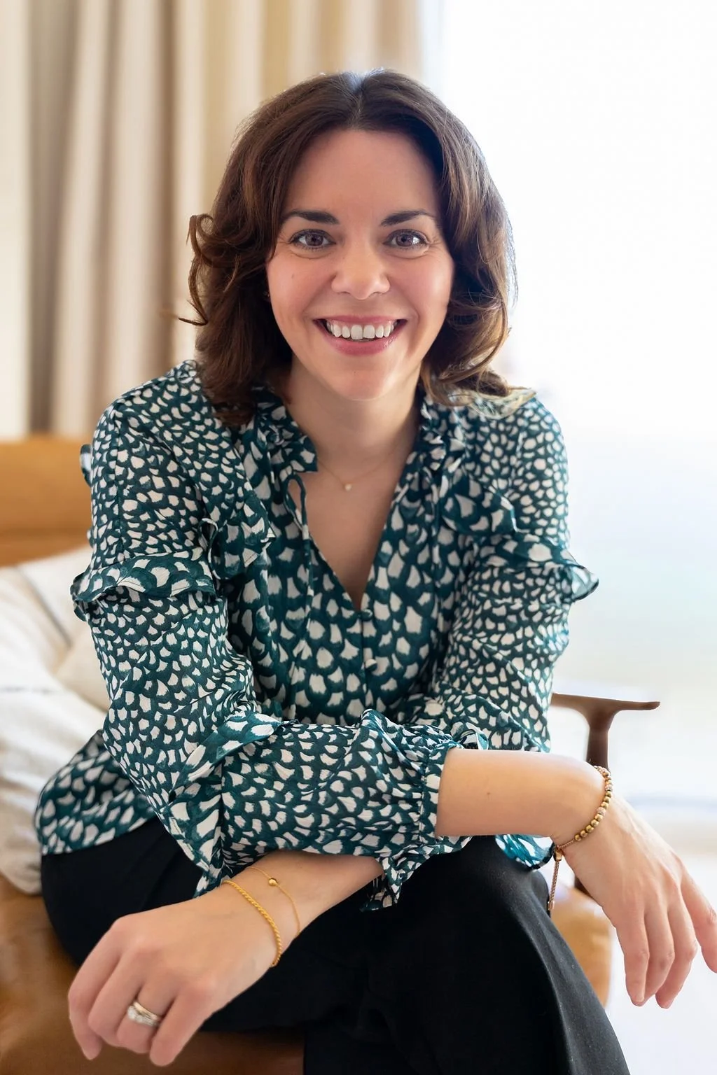 A smiling woman with brown hair wearing a patterned blouse, sitting on a bed in a well-lit room with curtains in the background.